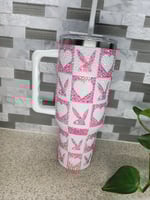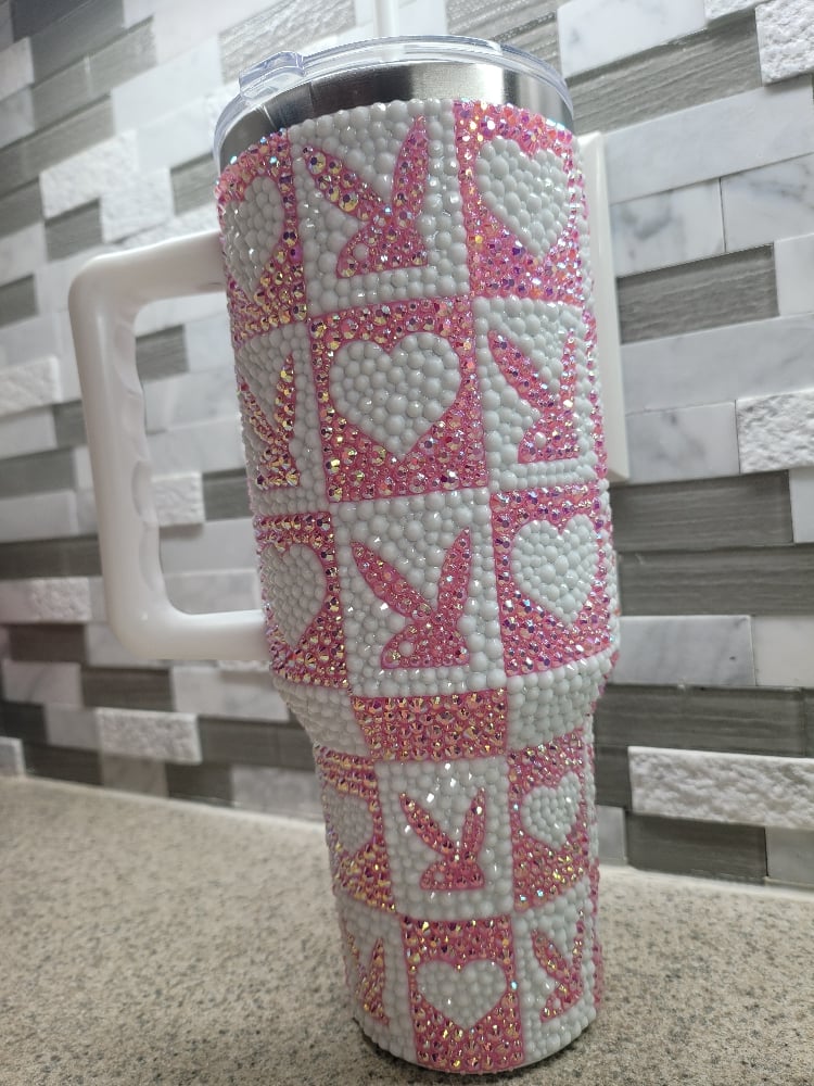 Beautiful resin rhinestone 40oz Ashland Tumbler featuring the iconic Playboy theme. Made from durable stainless steel with double-wall insulation keeping drinks cold and hot, a spill-resistant lid, and built-in handle, it’s perfect for on-the-go hydration with a touch of iconic flair.