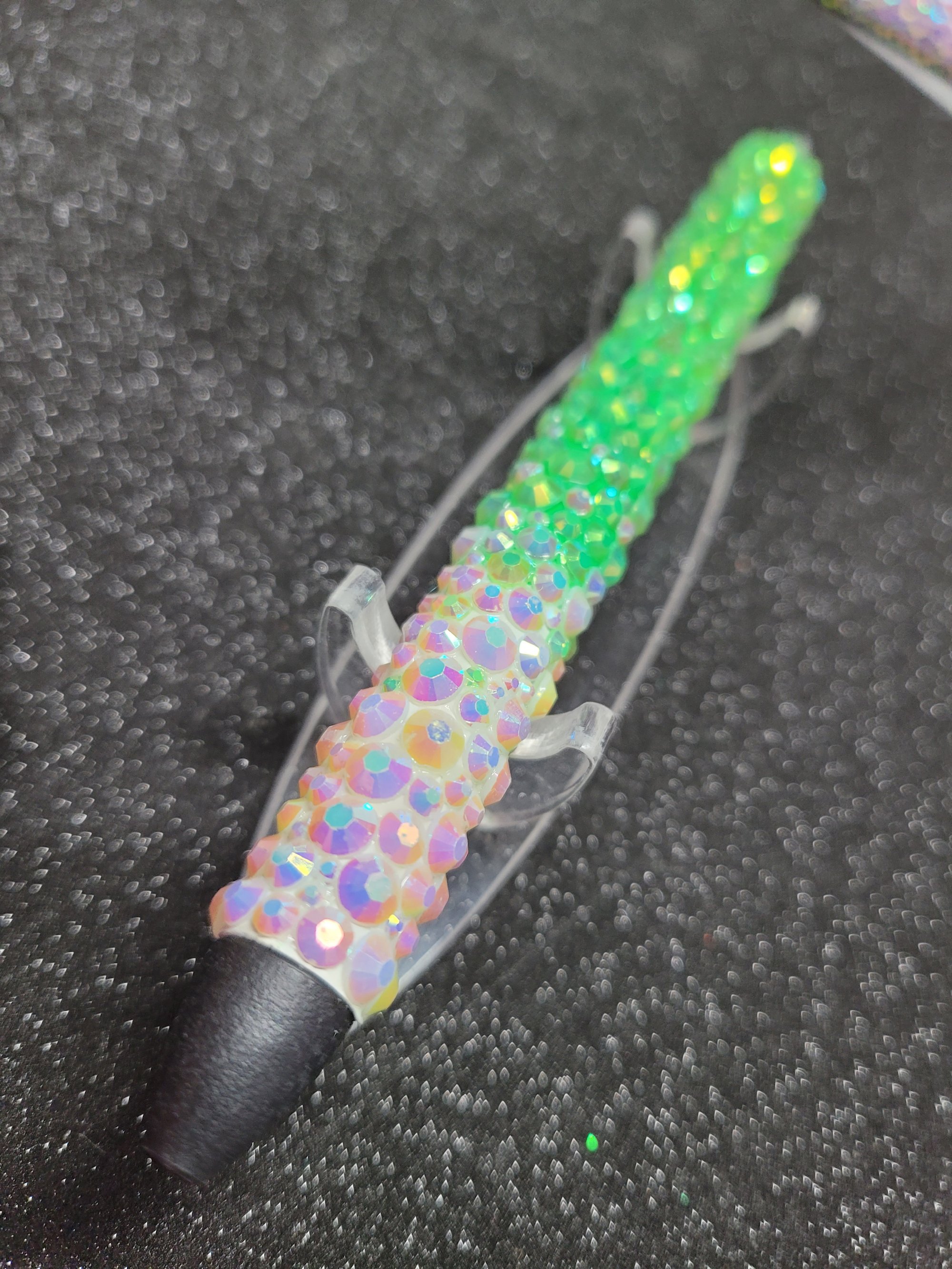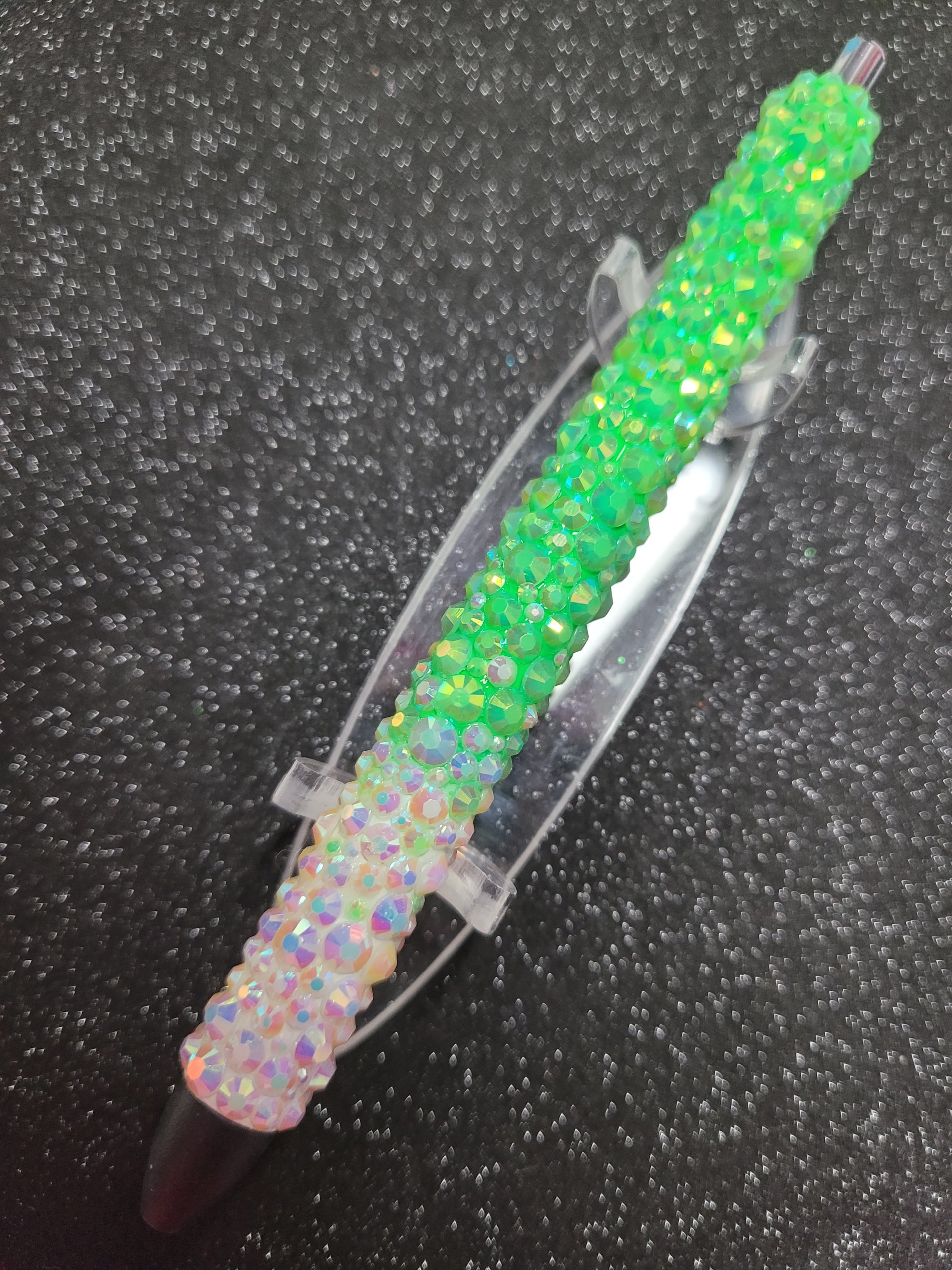 Beautiful resin rhinestone pen adorned with individually placed rhinestones, offering a touch of glamour to every writing experience. This pen includes lime green AB and white AB rhinestones.♡