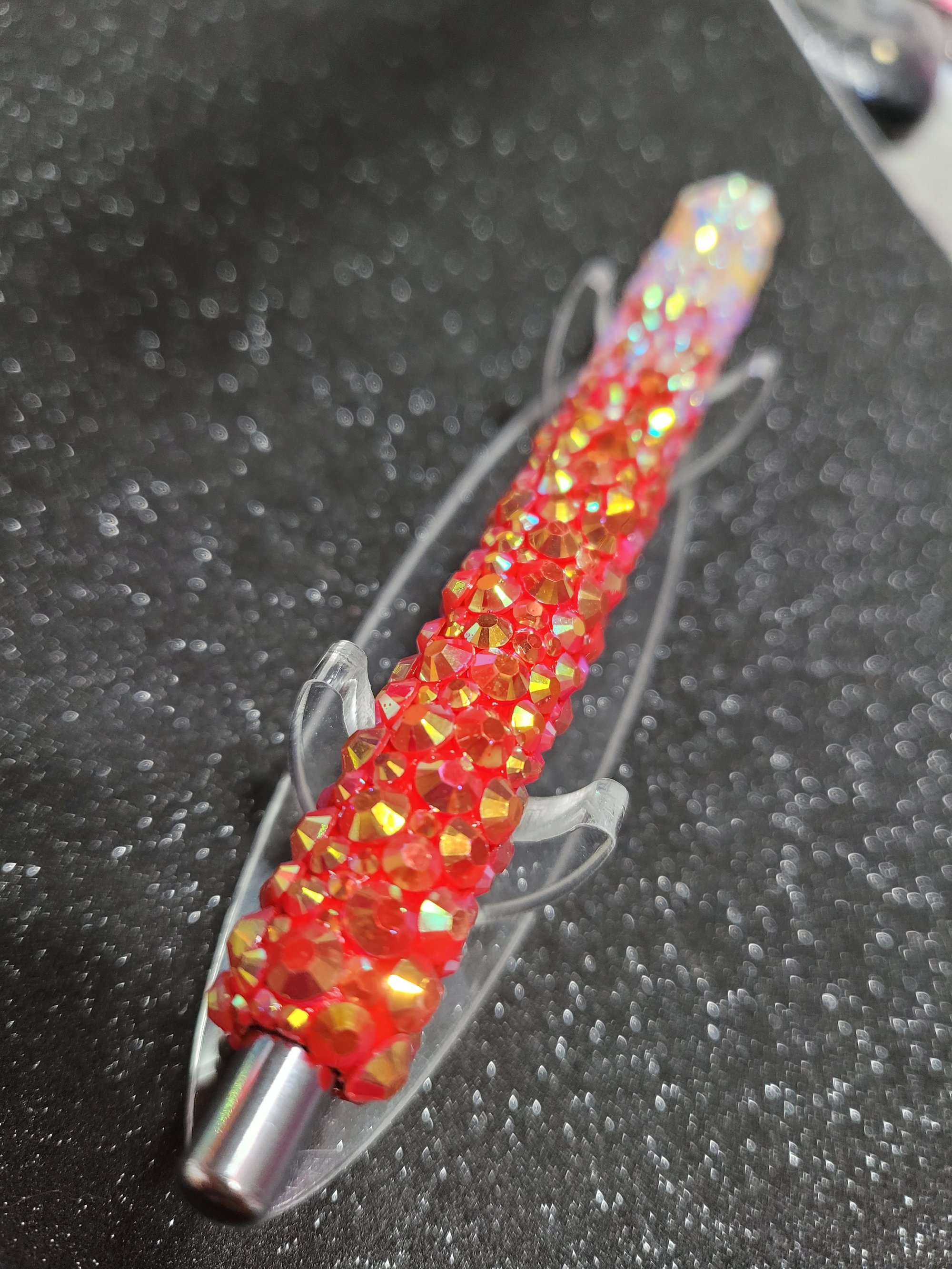 Beautiful resin rhinestone pen adorned with individually placed rhinestones, offering a touch of glamour to every writing experience. This pen includes red AB and white AB rhinestones.♡