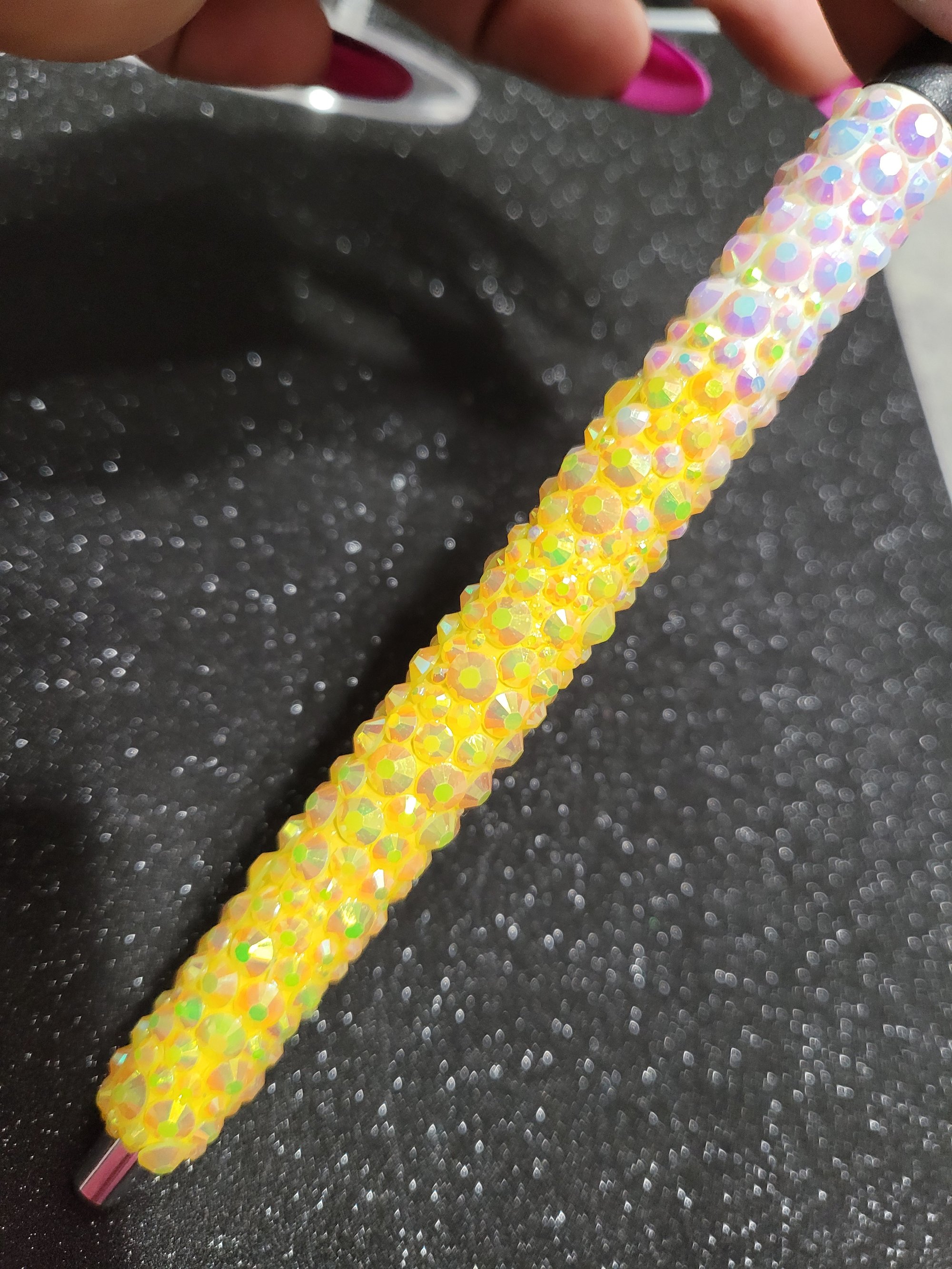 Beautiful resin rhinestone pen adorned with individually placed rhinestones, offering a touch of glamour to every writing experience. This pen includes yellow AB and white AB rhinestones.♡